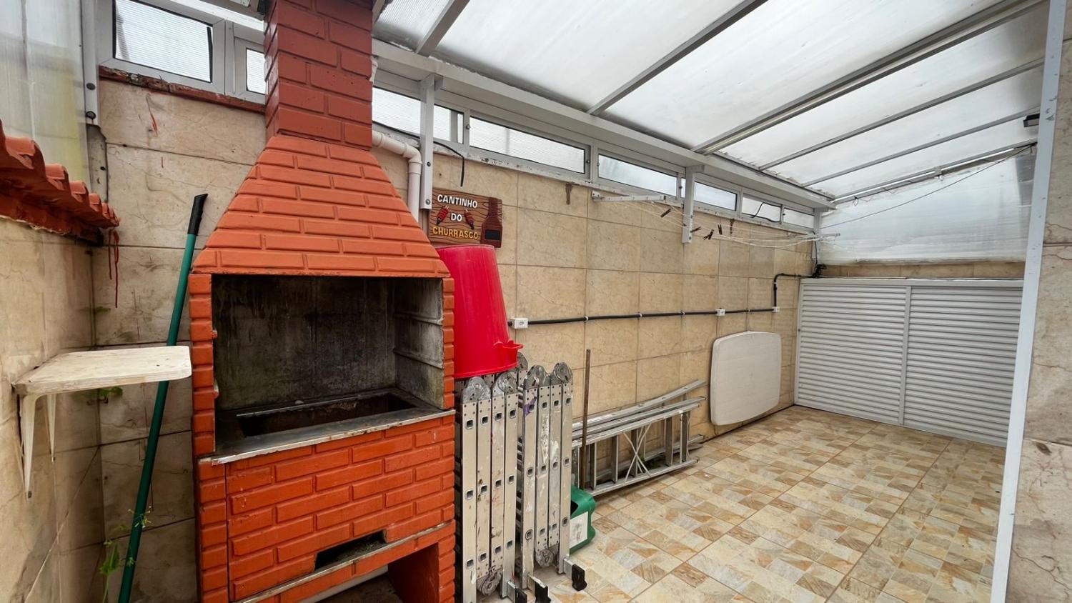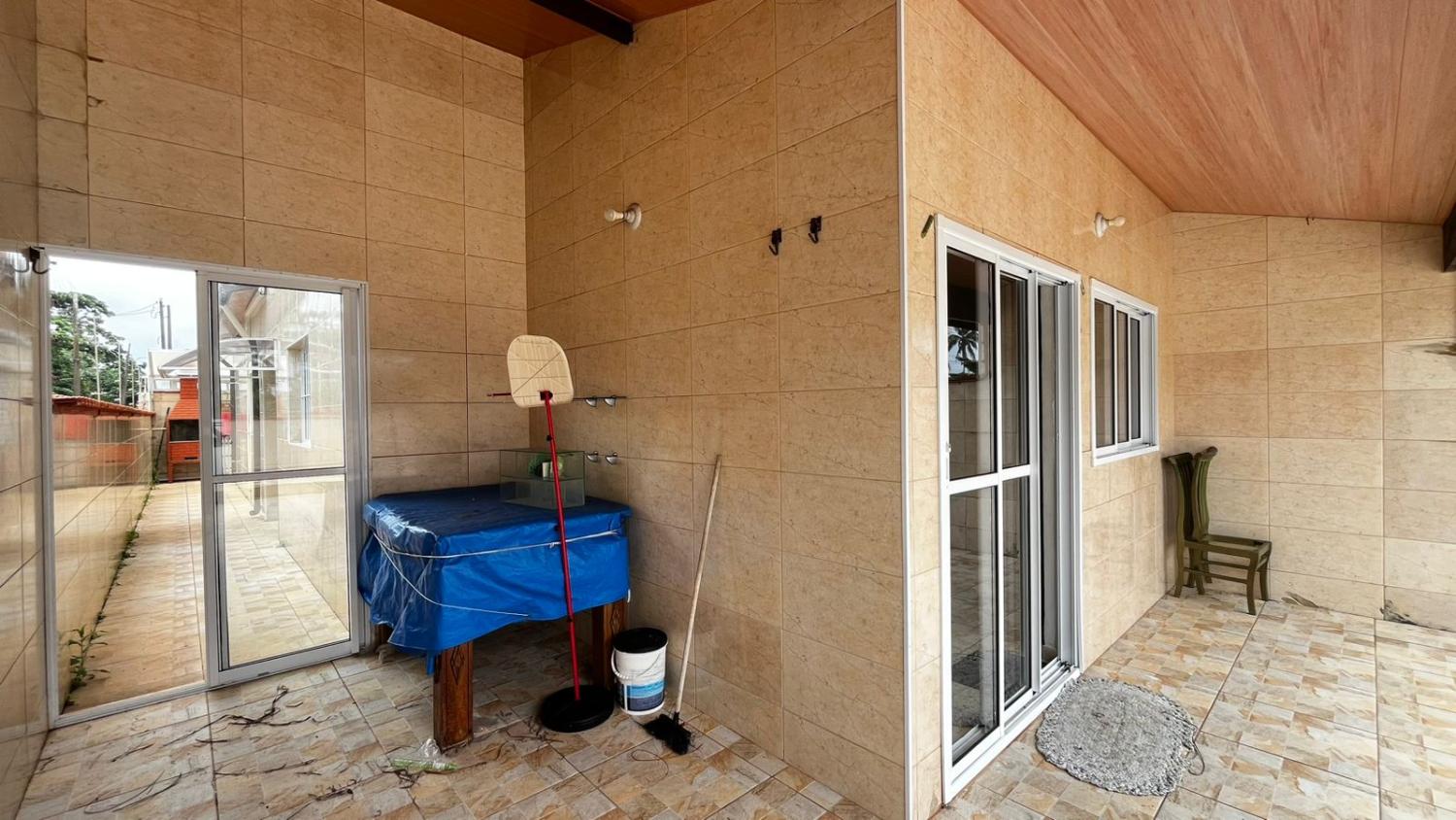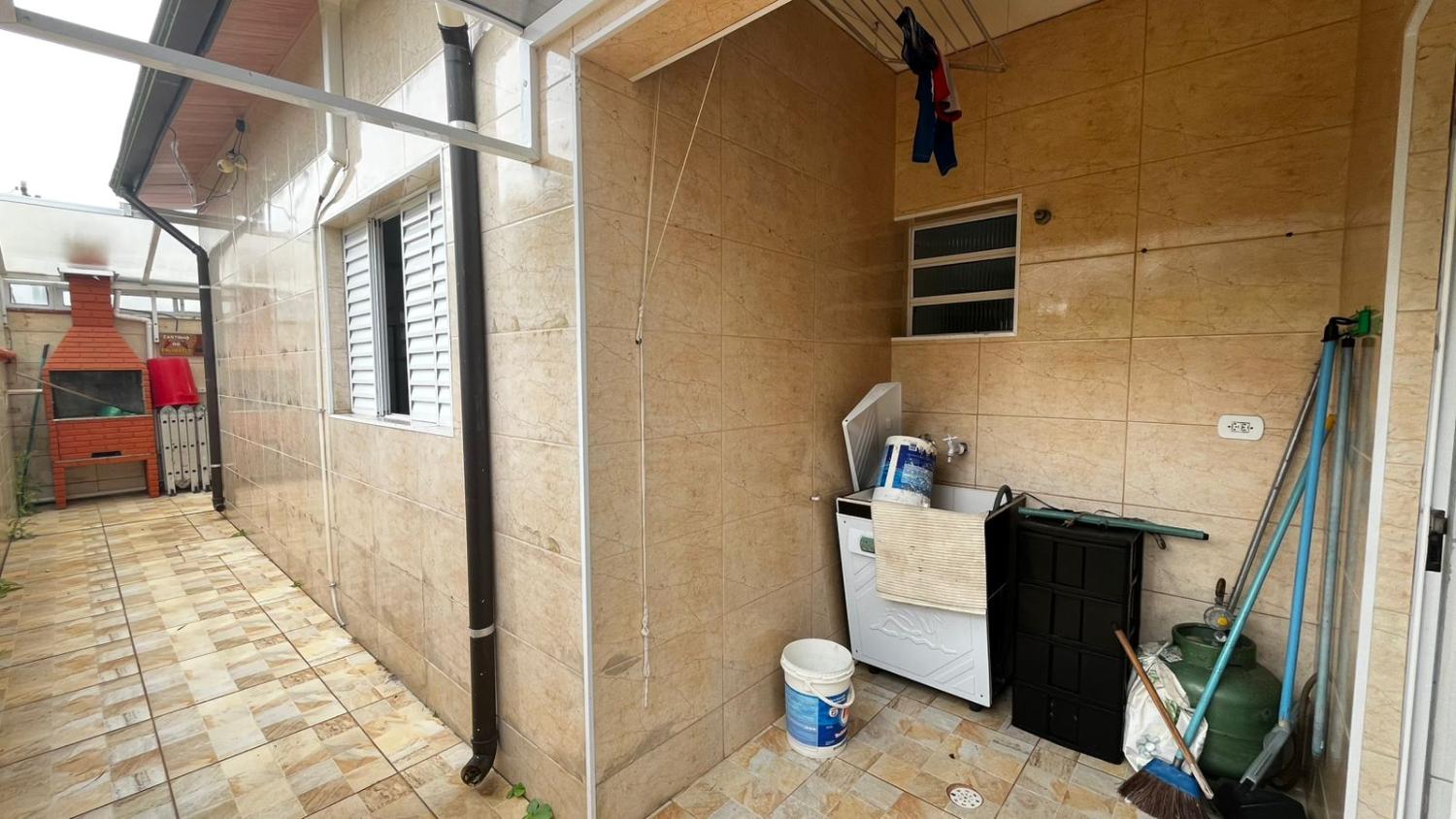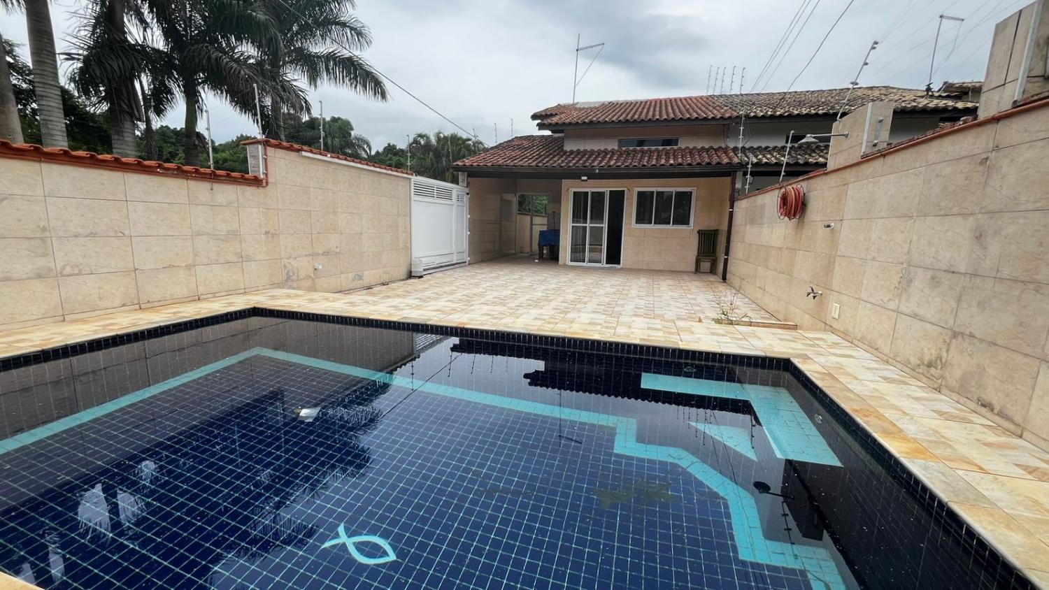 Área externa com lavanderia coberta, corredor lateral, espaço de churrasqueira, 3 vagas e piscina com cascata.