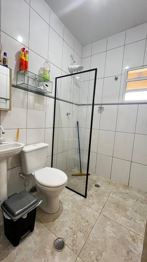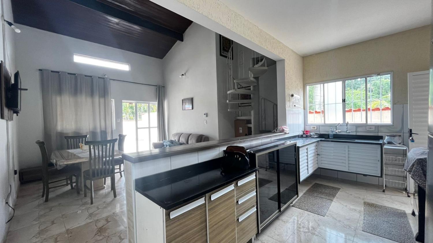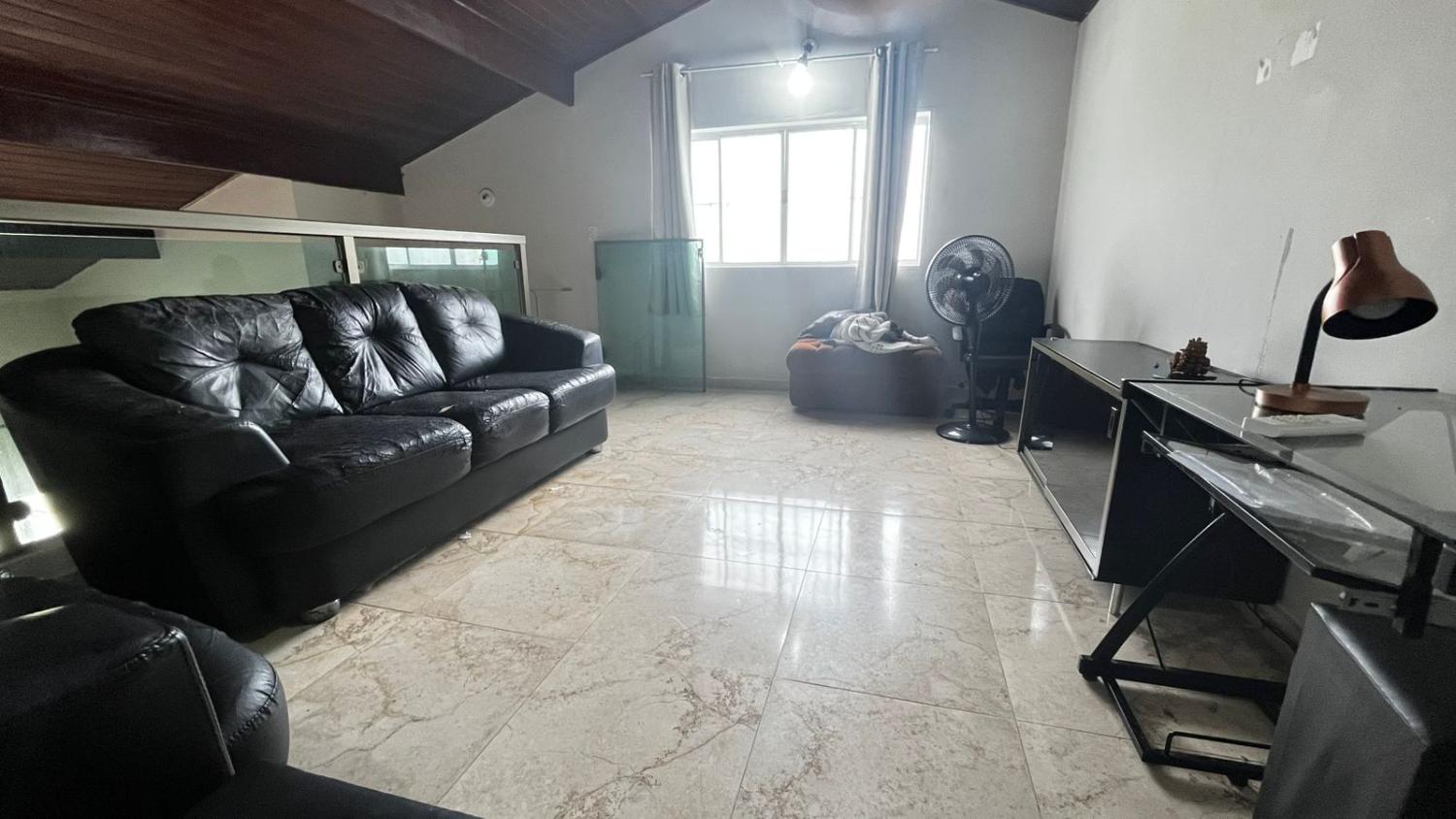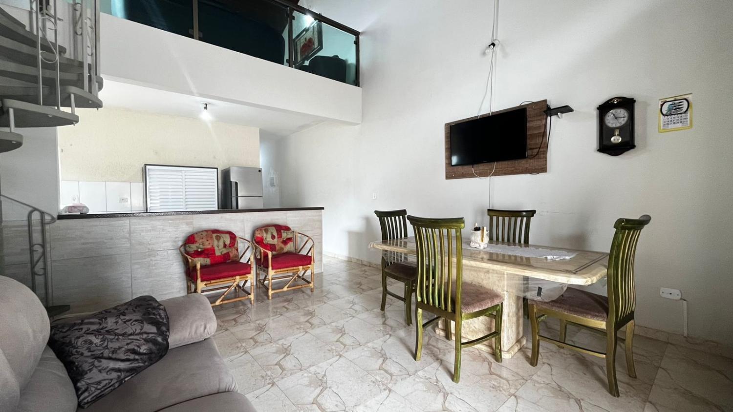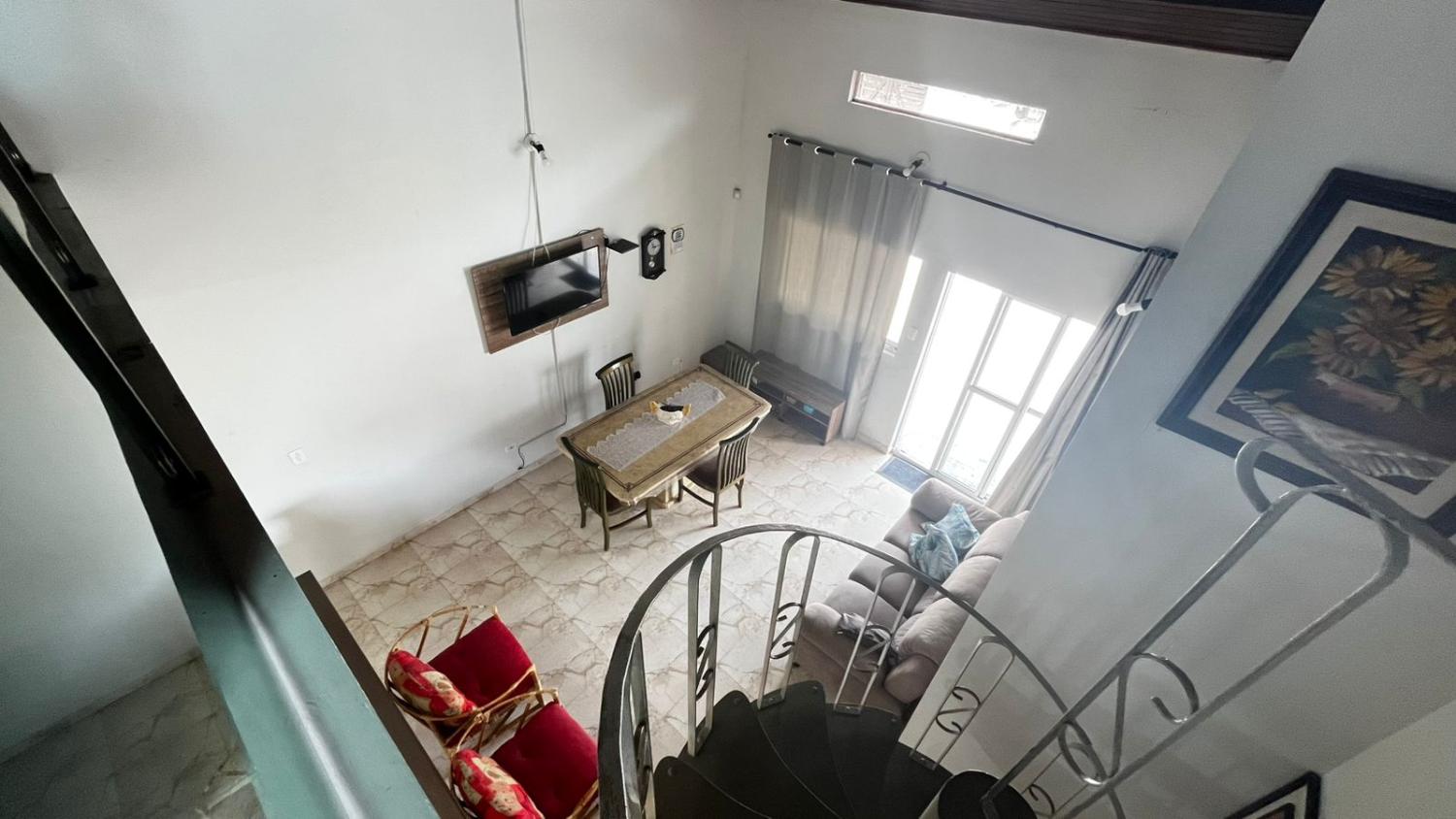 São 2 dormitórios, sendo 1 suíte, banheiro social, boa cozinha com armários, sala para 2 ambientes com, porta de correr em vidro para acesso a área da piscina e pé direto alto. Mezanino espaçoso, ideal para área de jogos, sala de TV ou 3° dormitório.