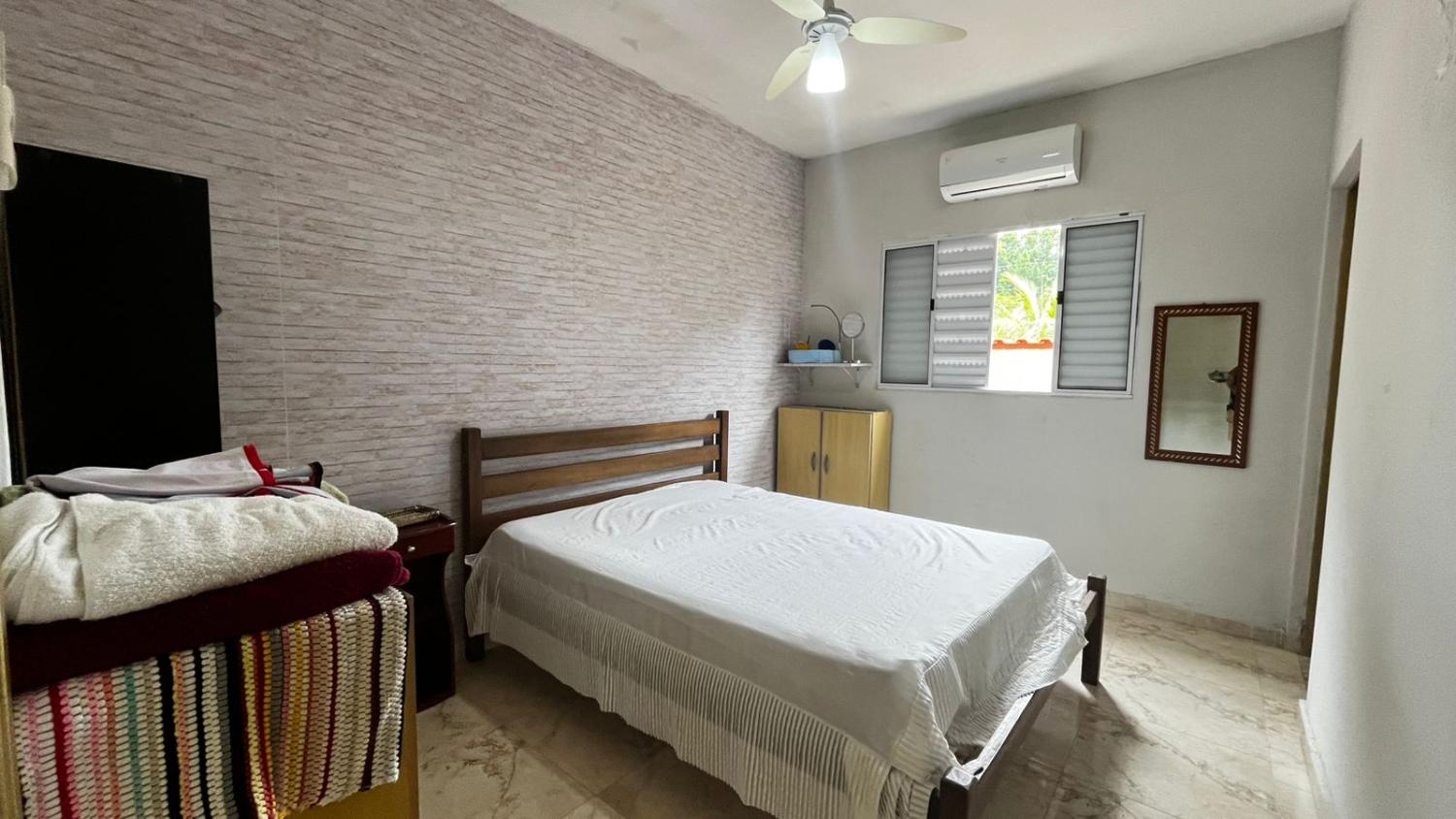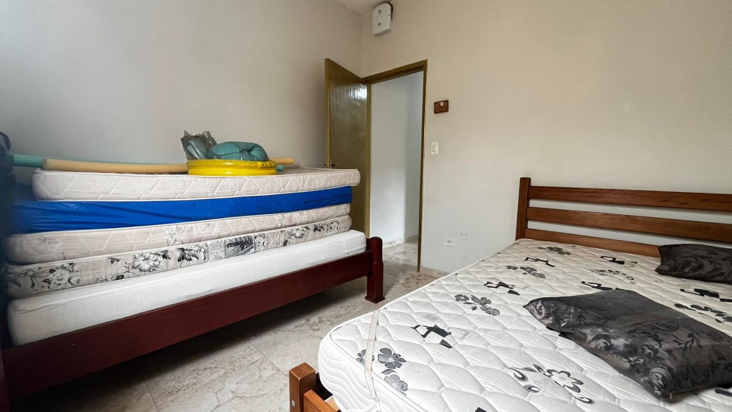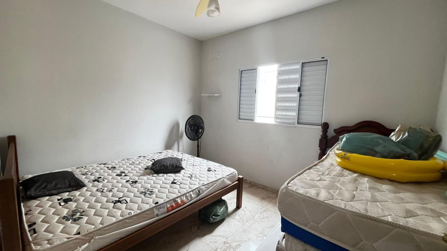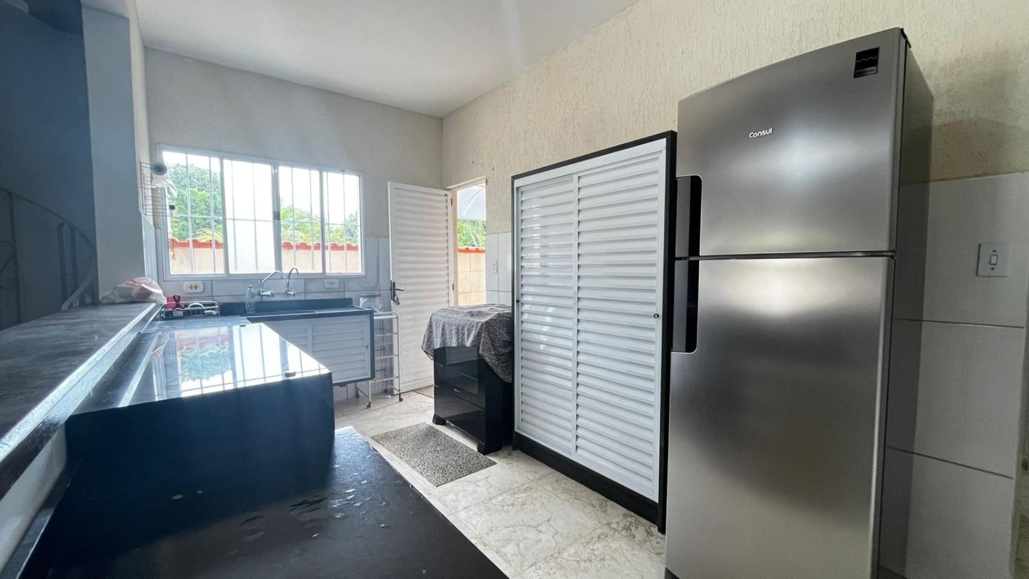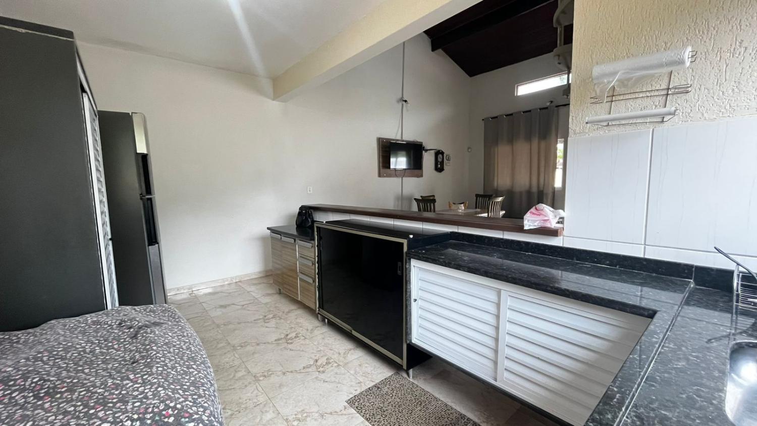 São 2 dormitórios, sendo 1 suíte, banheiro social, boa cozinha com armários, sala para 2 ambientes com, porta de correr em vidro para acesso a área da piscina e pé direto alto. Mezanino espaçoso, ideal para área de jogos, sala de TV ou 3° dormitório.
