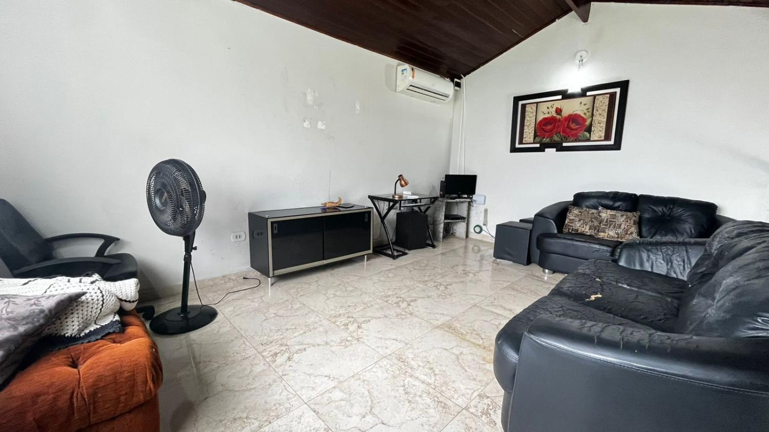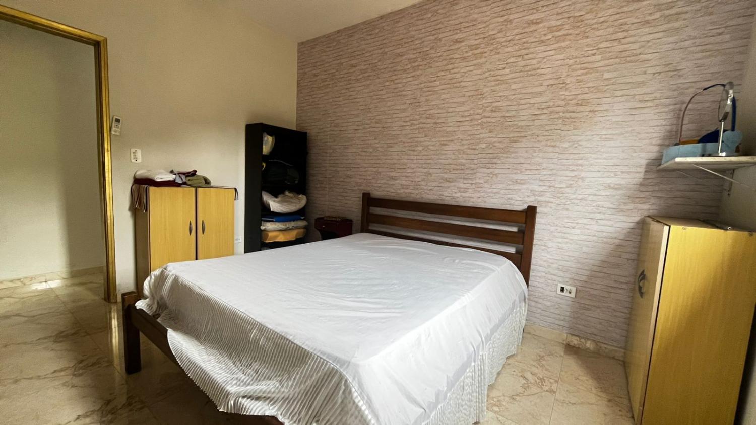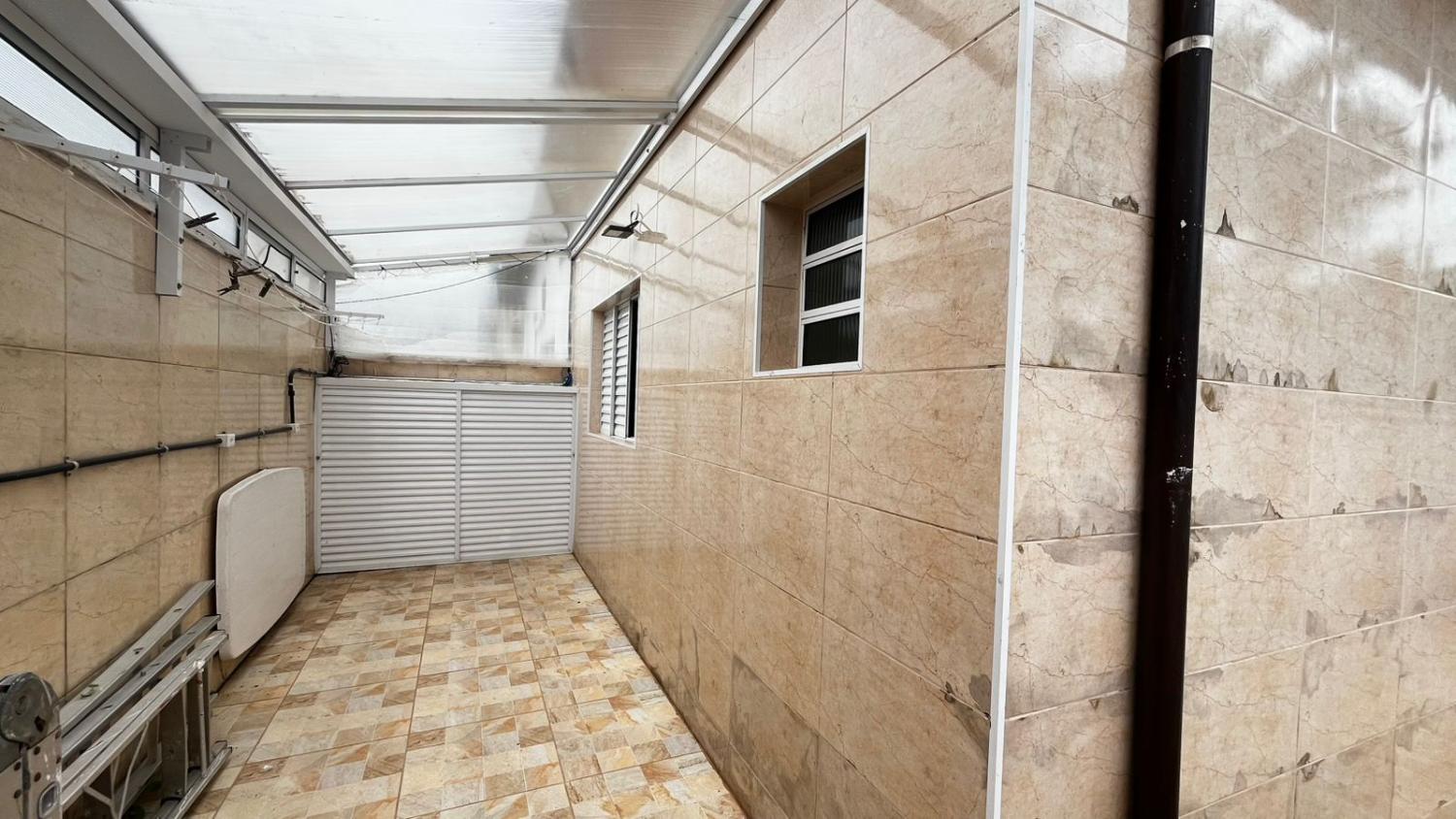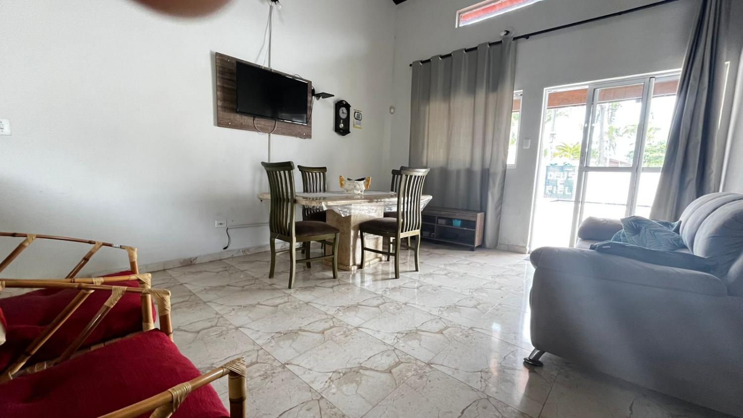 São 2 dormitórios, sendo 1 suíte, banheiro social, boa cozinha com armários, sala para 2 ambientes com, porta de correr em vidro para acesso a área da piscina e pé direto alto. Mezanino espaçoso, ideal para área de jogos, sala de TV ou 3° dormitório.